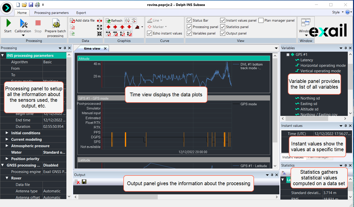 The Delph INS Subsea software interface is divided in various panels, each of them corresponding to a specific function.