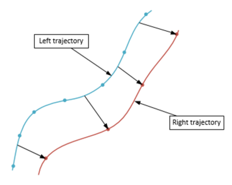 The forward trajectory separation can be regarded as alongitudinal separation between the two compared trajectories. The left trajectory separation can be regarded as a transversal separation between the two compared trajectories.