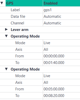 In the Processing panel, right click on the GPS parameter and select Add Operating mode. The Operating mode parameters are displayed. |