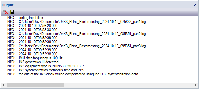 | 5. | Inspect the "Output" panel and check that there are no decoding problems. Warnings with missing IMU data indicate that the data recording is not correct and that the entire POSTPROCESSING stream transmitted by the inertial unit has not been written to the file. |