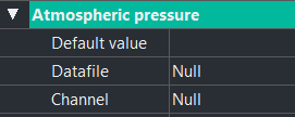 | 11. | Expand Atmospheric pressure, you may let the Default Value empty (in this case the default value is 1013.25 hPa) or drag and drop a atmospheric pressure data file from the Variables panel to Data File and Channel. |