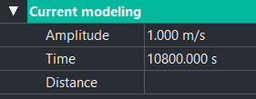 | 10. | Expand Current Modeling, enter an Amplitude, a Time and a Distance. If you let these fields empty the default values are amplitude: 0.5 m/s, time: 3 h, distance: 20 km. |