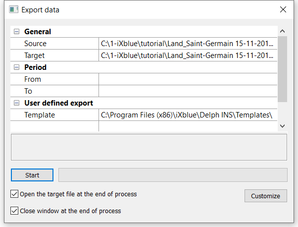 You can export Delph INS Subsea data under the format of your choice. With the User Defined Template option, you choose a template file (with a *.popudt extension) defining the output format. Delph INS Subsea is delivered with a couple of template files (Appendix User Defined Export Template). These template files can be edited.