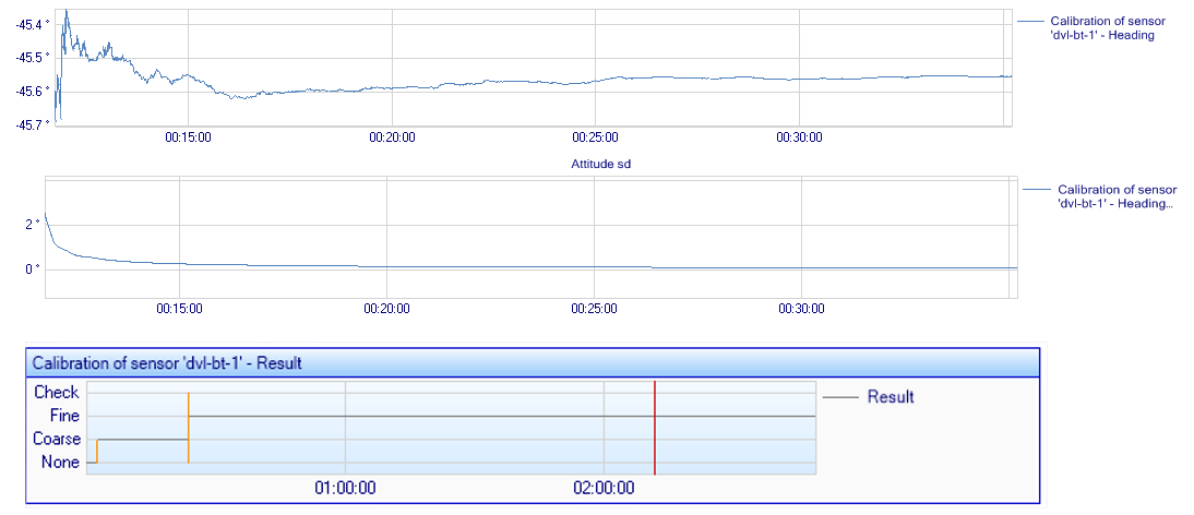 If the calibration results are ok, it switches from coarse to fine, and Scale Factor Error heading errorestimation converge to a stable value.The calibration is declared OK when the Scale Factor SD error AND Heading SD error goes under 0.1% and 0.1°. |