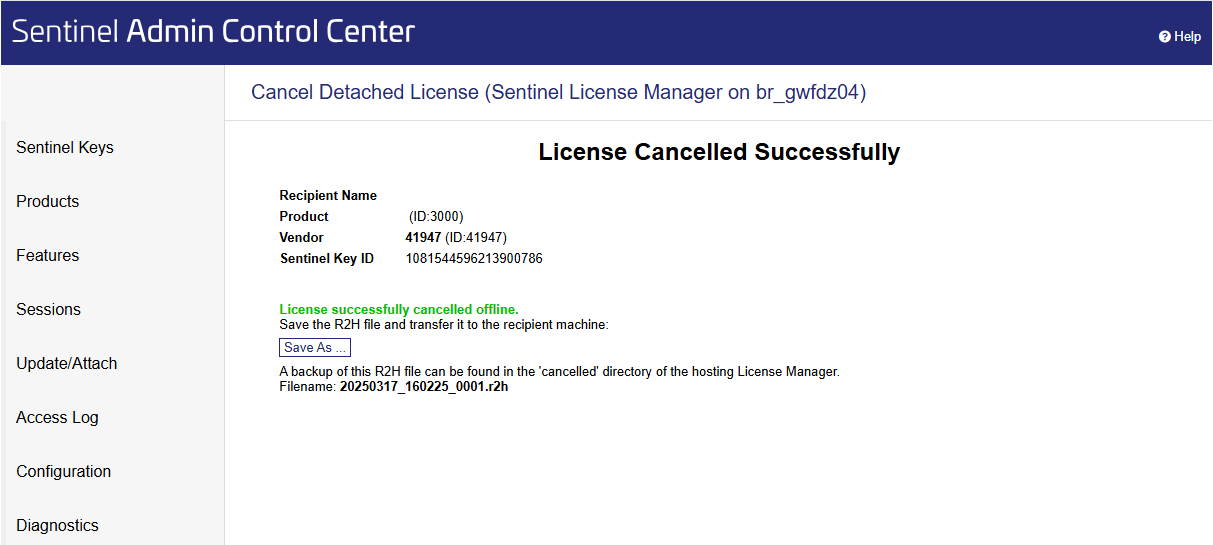 | 4. | Click on the Cancel License button. The system create a .r2h (remote to host) that shall be saved using the Save As... button: |