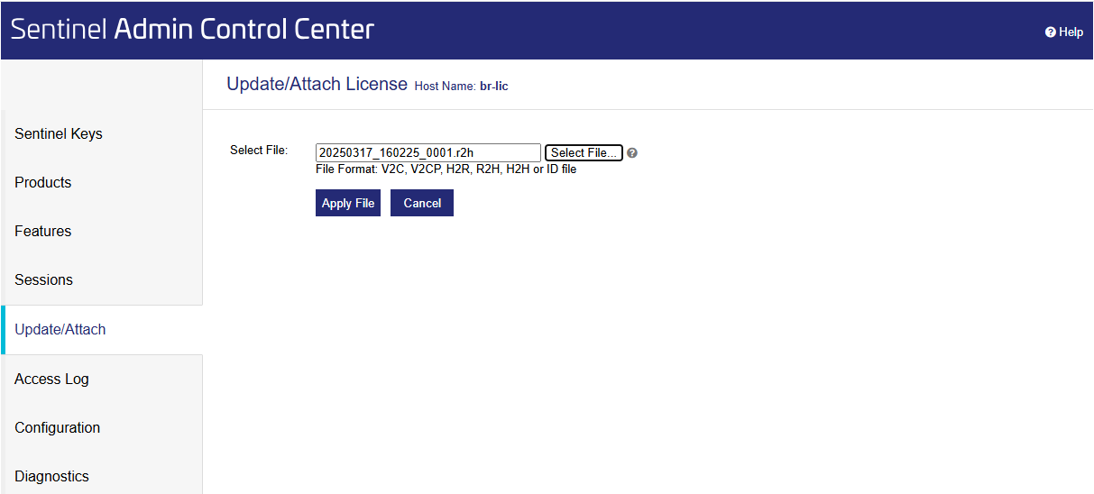 | 7. | Click on the Update/Attach tab and select the .r2h file received from the remote machine: |