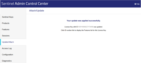 | 8. | Click on Apply File. A new page appears to confirm the transfer of the detached license to the server: |