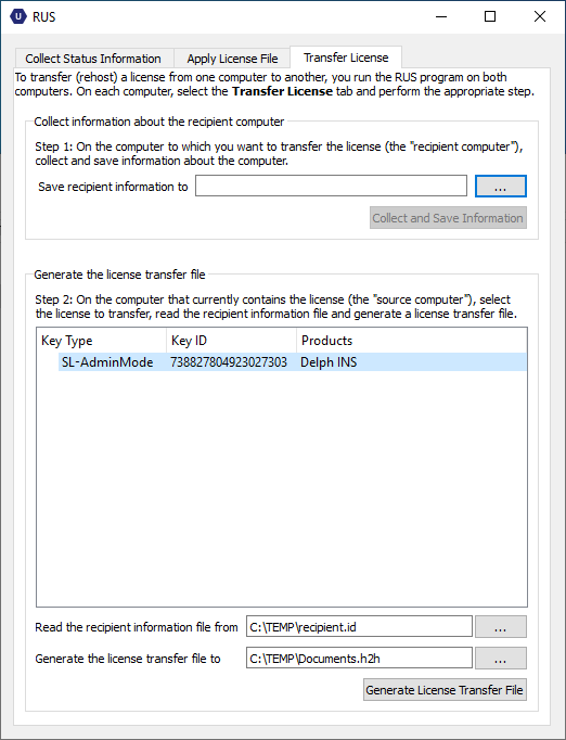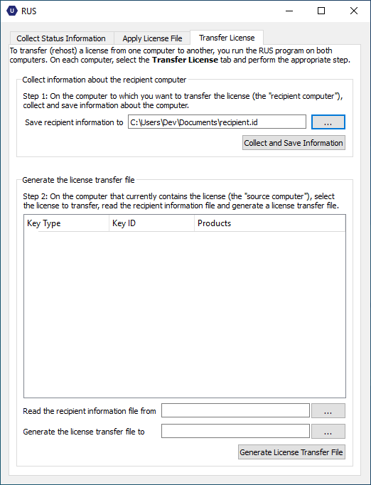 | 2. | Click on the Transfer License tab. Select a file name (.id file) for the recipient information and click on Collect and Save Information button. |
