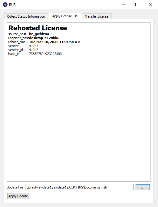 | 8. | Open the License Manager, click on the Apply License tab and select the license transfer file (.h2h file): |