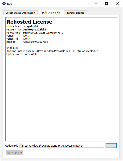 | 9. | Click on Apply Update button to transfer the license. A message inform you of the result of the operation: |