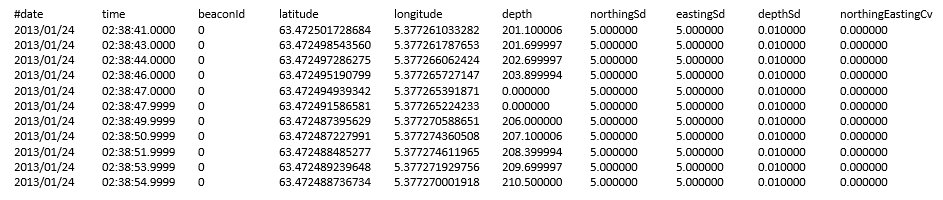 In this example a text file containing USBL data is converted to XPF using the provided definition file. The USBL data has been converted to a specific format as described in the template file USBL.gtd